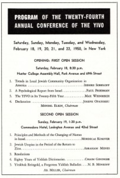 Ten years after relocating to New York, YIVO held its twenty-fourth annual conference, the program for which was publicized in advance in the February 1950 issue of Yedies. The wide range of topics focused on Jewish life in the U.S. and Israel, and included presentations on Yiddish dictionaries and the experiences of Jewish children during the war. Among the keynote speakers was Yiddish writer Joseph Opatoshu.