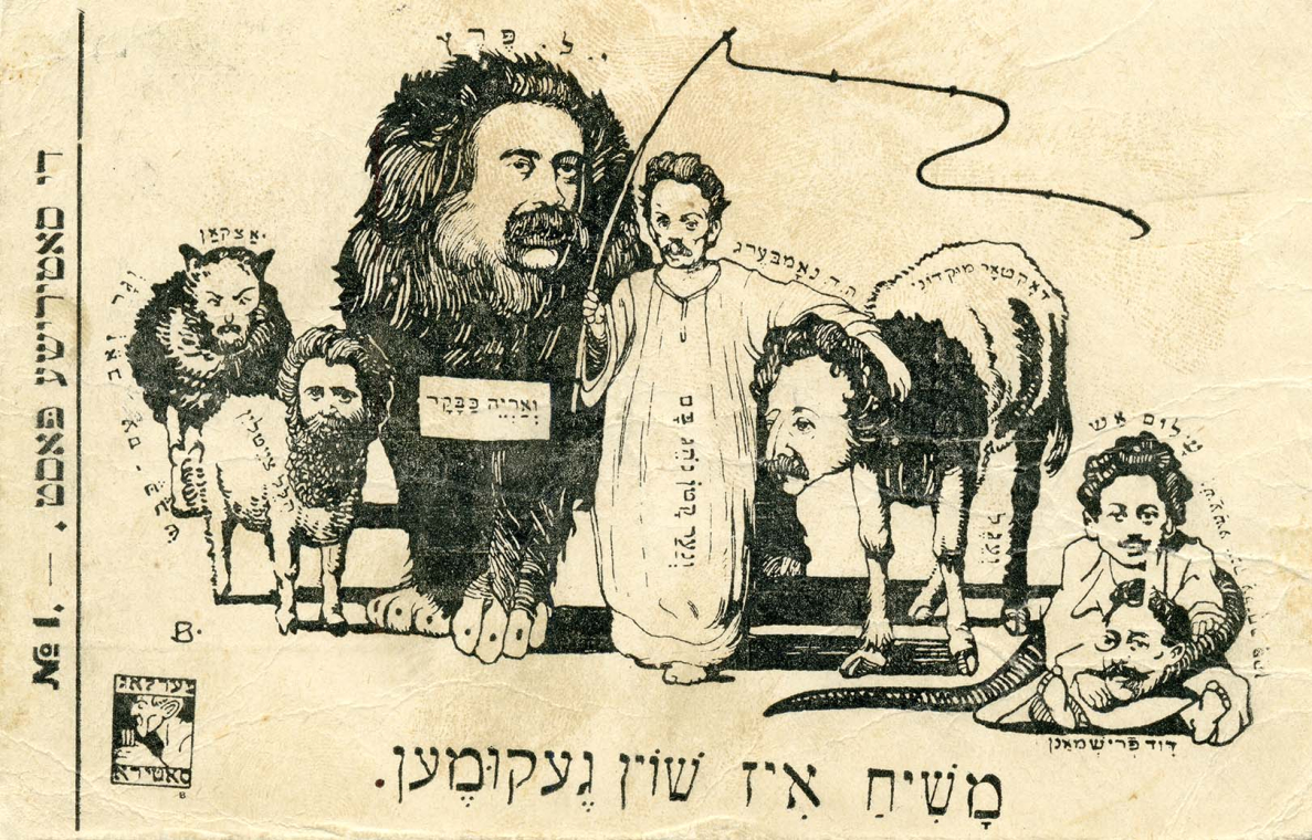 Referencing Isaiah 11:6, which describes how “the wolf will dwell with the lamb,” this cartoon casts a group of Yiddish writers as the animals who will be at peace with one another after the arrival of the messiah. The irony of it was that many of these writers were in constant dispute and often fulminated against one another in the Yiddish press. YIVO Archives.