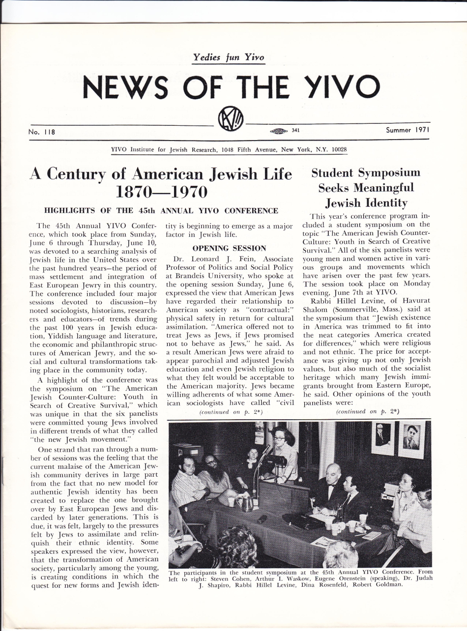 In 1971, YIVO’s Annual Conference had, as its focus, the past hundred years of Jewish life in the United States. This was no strictly celebratory look at American Jewish history and culture, however. On the contrary, Yedies reported that many of the papers delivered at the conference commented on a “malaise” in American Jewish communal life, supposedly resulting from the fact “that no new model for authentic Jewish identity has been created to replace the one brought over by East European Jews and discarded by later generations.”