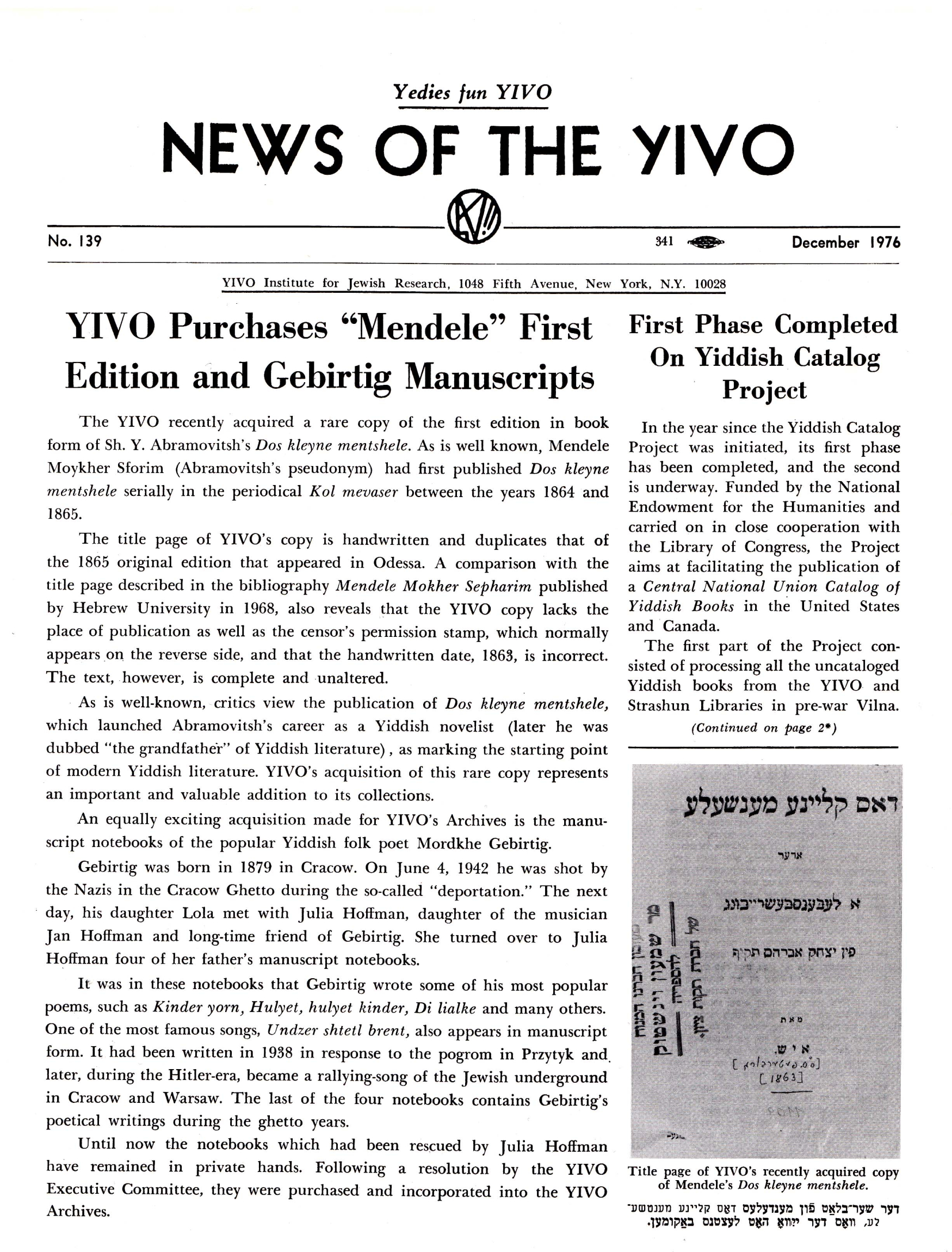The December 1976 edition of Yedies announces the acquisition of a rare first edition of  Dos kleyne mentshele, a book by Mendele Moykher Sforim that marks “the starting point of modern Yiddish literature.” The same article announces the purchase of the manuscript notebooks of Mordechai Gebirtig, a folk song composer who died in the Krakow Ghetto. His song Under shtetl brent (Our town is burning) became an anthem of the Jewish anti-Nazi resistance in Krakow and Warsaw.