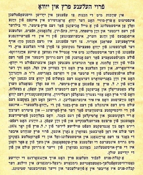 In 1938, Yedies reported on the progress of its creation of a special permanent exhibition in honor of the great Yiddish writer Yitskhok Leibush (Isaac Leib) Peretz: