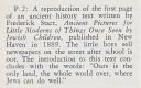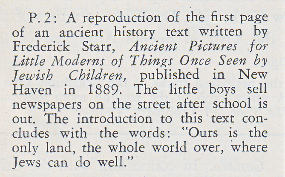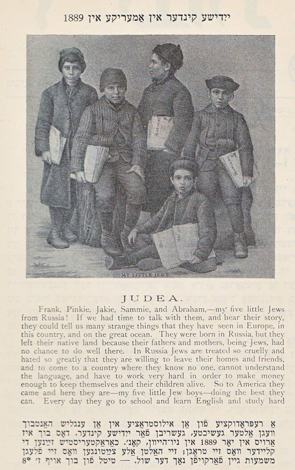 Among the books that came its way in the mid-1940s, was this oddity, Ancient Pictures for Little Moderns of Things Once Seen by Jewish Children, by Frederick Starr, published in New Haven in 1889. The librarians and archivists must have found it as quaint and weird as we do today, though the Yiddish caption in the June 1946 issue of Yedies seems to take it as an ethnographic document on its own terms, pointing out “the characteristic clothing” of the boys in the illustration, newspaper sellers on the Lower East Side.
