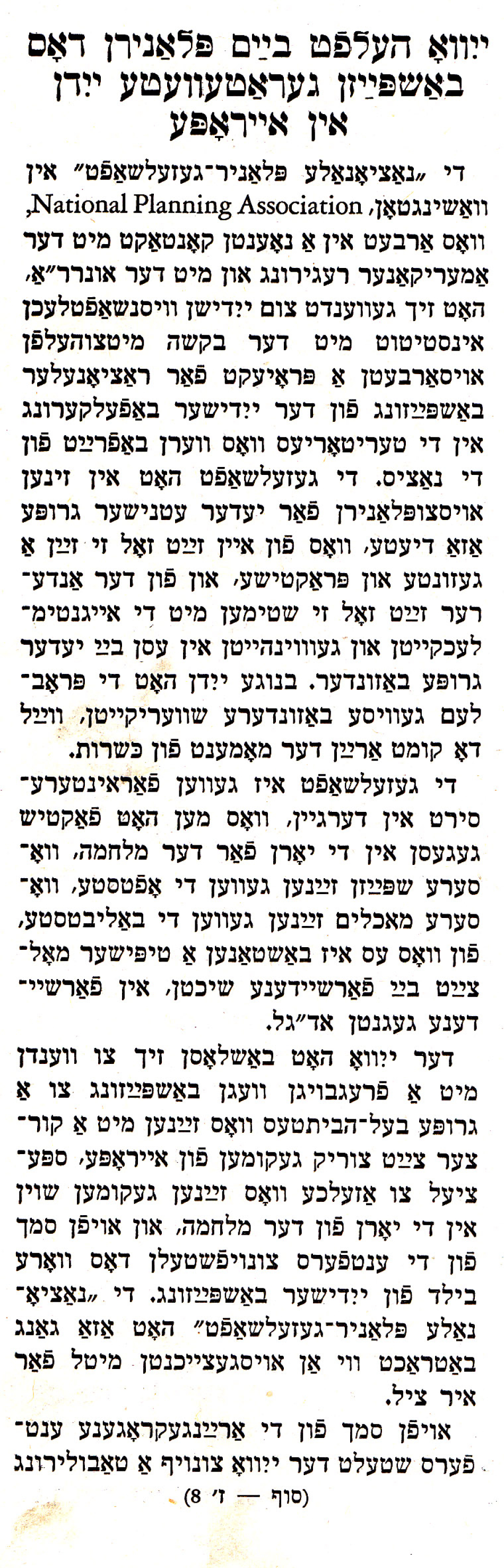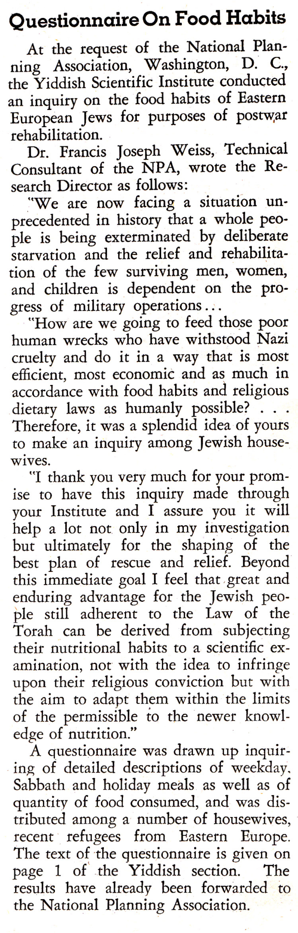 The following article from the September 1944 issue of Yedies reveals that YIVO was searching for ways to be part of this effort in ways that went beyond the provision of cultural and educational resources for survivors. Here, YIVO reports that it is cooperating on a special project with the National Planning Association, a nonpartisan research institution founded by prominent business and labor leaders who believed that the private sector should actively participate in the formulation of public policy. (See the papers of this now defunct organization at the Walter P. Reuther Library.) This project took advantage of YIVO’s intimate knowledge of everyday Jewish life, its visceral connection with European Jewish survivors, and its long experience in creating networks for the purpose of information-gathering to help plan for the provision of food to Jewish refugees after the war.