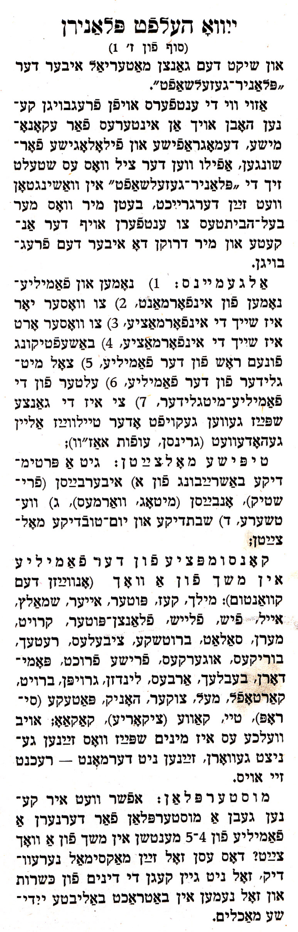 The Yiddish version of the article lists some of the questions that were sent out to Jewish immigrant housewives in the U.S. about what their families ate in Europe before emigration. They include: