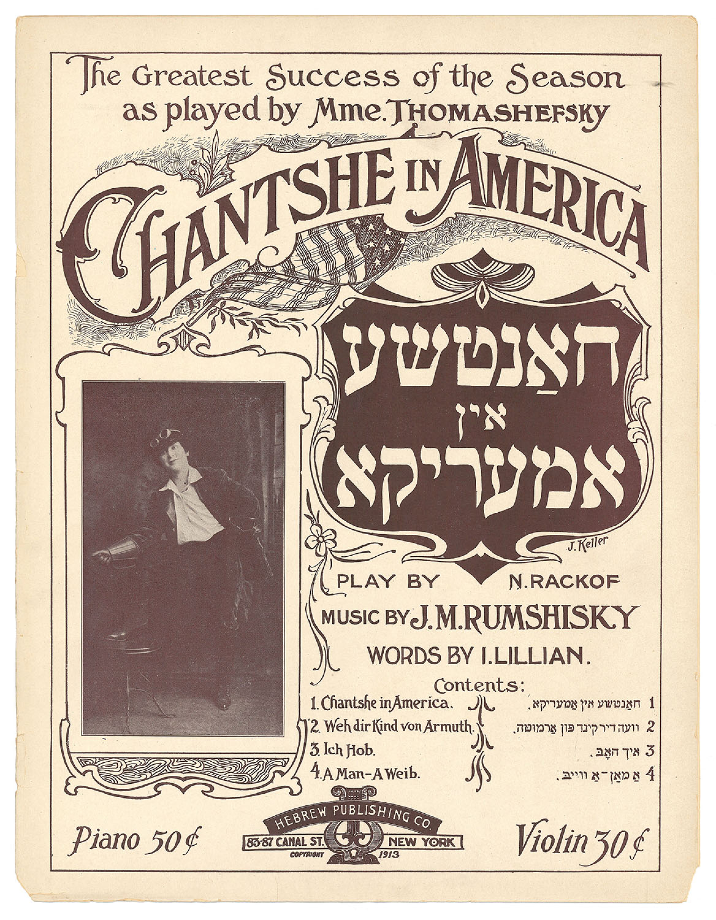 Premiered in New York City, Khantshe in Amerike was subsequently performed around the world. The show was a turning point in Rumshinsky’s output, noted for having  put “American rhythm” on the Yiddish stage for the first time according to Yiddish theater historian Zalmen Zylbercweig (1894–1972). Khantshe was also a star vehicle which marked a pivotal moment in the career of singer, actor, and impresario Bessie Tomashefsky.